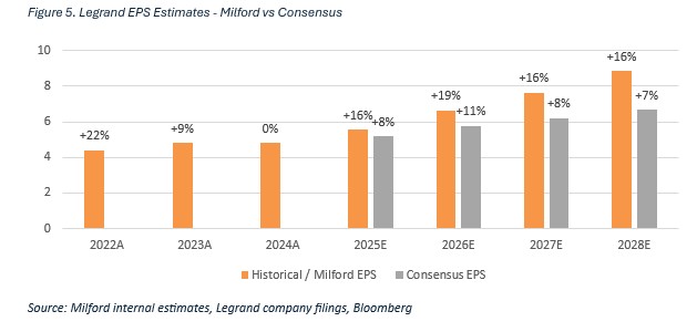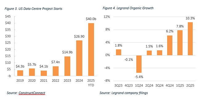 Milford initiated a position in Legrand in late 2024. We believed that the growth rate of Legrand’s data centre business was poised to accelerate and was being underappreciated by the market. While not central to the thesis, Legrand also offers cyclical upside from any improvement in European and US construction markets, with volumes at a trough below 2019 levels.